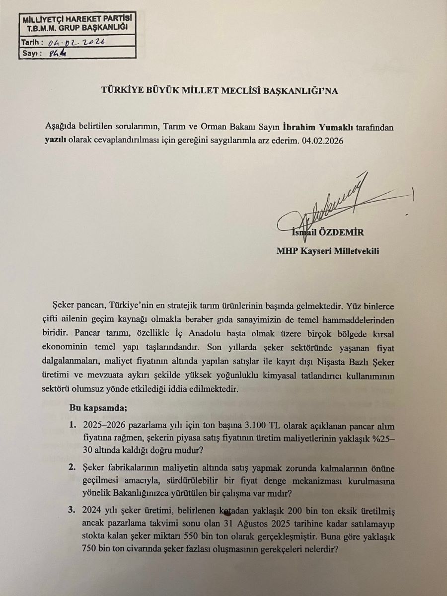 Sosyal medya hesabından paylaşım yapan MHP Genel Başkan Yardımcısı ve Kayseri Milletvekili İsmail Özdemir, “Pancar ve şeker üretimi ile şeker fabrikalarının karşılaştığı sorunları ilgilendiren politikalarla alakalı soru önergelerimizi Tarım ve Orman Bakanlığı’na iletilmek üzere TBMM Başkanlığı’na verdik. Kayseri’de pancar üreticisi çiftçilerimizle, çiftçilerimizin ortak kooperatifi olan Kayseri Şeker Fabrikası’na yönelik desteklerimiz devam edecektir” ifadelerine yer verdi.