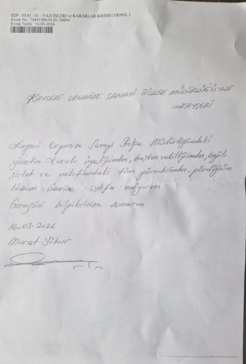 Kayseri OSB Bölge Müdürlüğü’ne istifa dilekçesi sunan Murat Yibur, şu ifadelere yer verdi: “Kayseri Organize Sanayi Bölge Müdürlüğü’ndeki yönetim kurulu üyeliğimden, Başkanvekilliğimden, bağlı şirket ve vakıflardaki tüm görevlerimden gördüğüm lüzum üzerine istifa ediyorum. Gereğini bilgilerinize sunarım.”